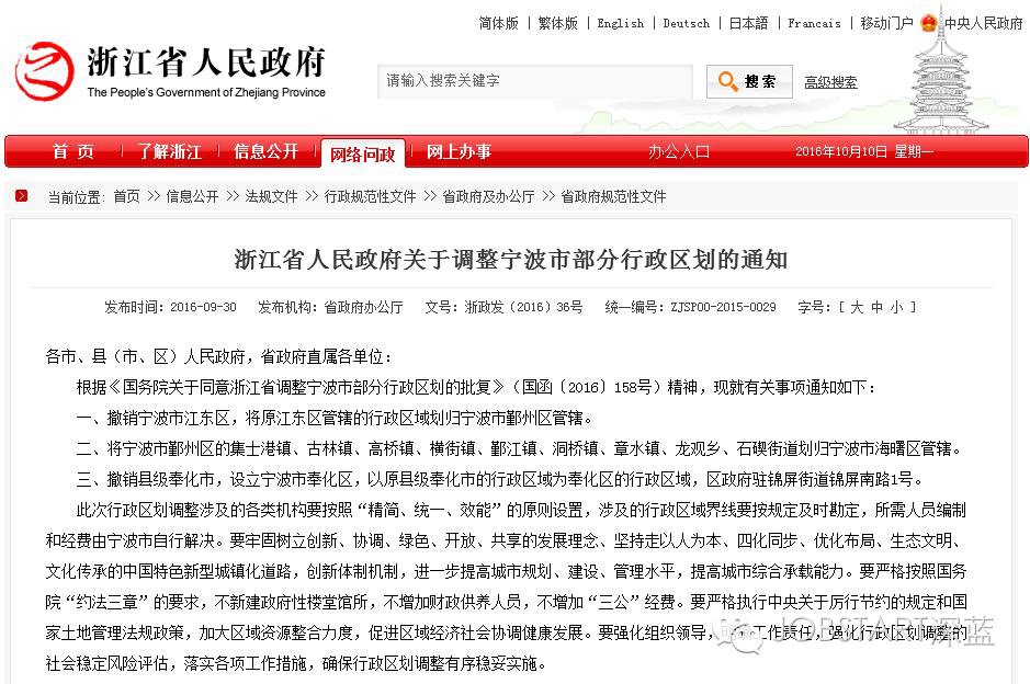 根據(jù)《國務(wù)院關(guān)于同意浙江省調(diào)整寧波市部分行政區(qū)劃的批復(fù)》(國函〔2016〕158號(hào))精神,現(xiàn)就有關(guān)事項(xiàng)通知如下: