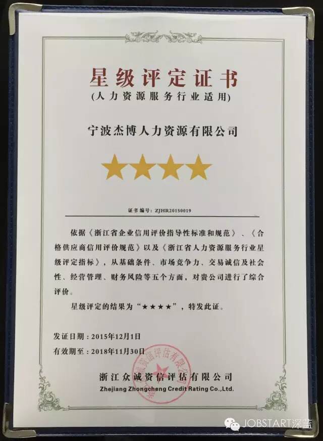 2016年1月6日,在杭州召開的浙江省人力資源服務協(xié)會第一屆第三次會員大會典禮上,包括寧波杰博人力資源有限公司在內的17家人力資源企業(yè)獲評首批“浙江省人力資源服務星級企業(yè)”殊榮,其中,杰博人力資源獲評“四星級”企業(yè)。